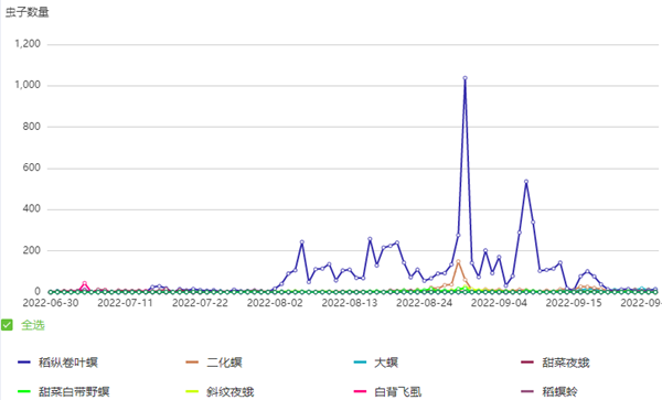 今年8月末,受臺風“軒嵐諾”影響,杭州市余杭區(qū)出現(xiàn)持續(xù)大風和高濕天氣,托普云農(nóng)智能蟲情測報燈有效監(jiān)測到稻縱卷葉螟及二化螟蛾峰。