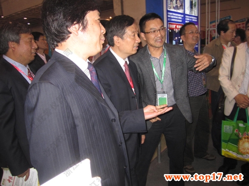圖為:托普總經(jīng)理陳渝陽(yáng)先生陪同張延秋局長(zhǎng)等一行領(lǐng)導(dǎo)參觀托普展位