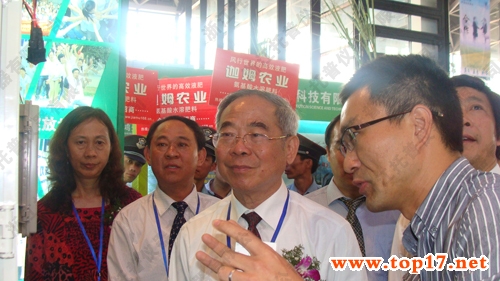 圖為:原農(nóng)業(yè)部陳耀邦部長(左二)在全國農(nóng)技推廣服務中心夏敬源主任(左三)、栗鐵申副主任(右二)、首席專家彭世琪女士(右一)等陪同下參觀托普展位。