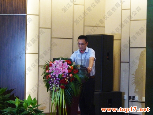 圖為:托普儀器陳渝陽總經理作為企業(yè)代表在會上做詳細報告