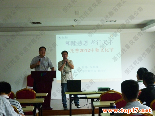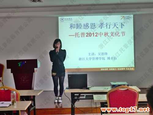 2012年9月22日,在中秋佳節(jié)來臨之際,浙江托普儀器有限公司在公司內(nèi)部舉辦了一場2012年中秋文化節(jié)活動。活動圍繞“和睦感恩,孝行天下”的主題開展,并邀請浙江大學(xué)管理學(xué)院吳恩峰博士前來培訓(xùn)講解。