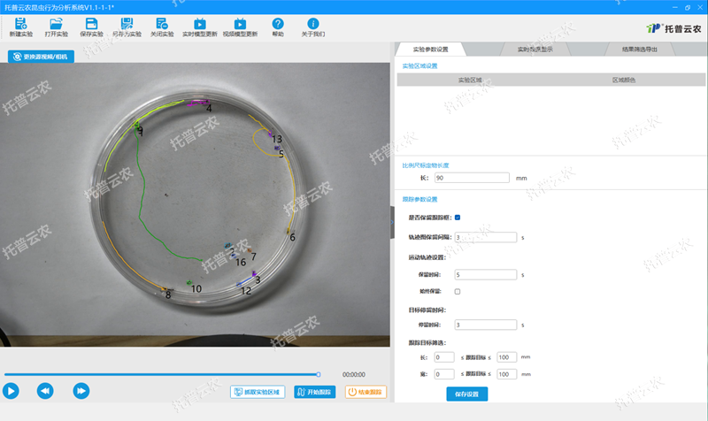 3.目標跟蹤參數(shù)設(shè)置:用戶可根據(jù)需要,調(diào)整需要跟蹤的目標昆蟲大小、停留時間等信息,提高跟蹤的精度。