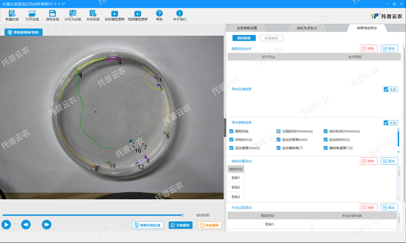 托普TP-KCXW昆蟲行為分析系統(tǒng)是由昆蟲行為分析系統(tǒng)軟件、專用筆記本電腦、高清高幀工業(yè)相機組成。使用專用軟件對錄制的昆蟲活動視頻或傳入實時昆蟲觀測視頻流進行分析,識別并跟蹤目標昆蟲,獲取昆蟲隨時間變化的(X,Y)坐標,同時記錄輸出十余種昆蟲運動相關(guān)參數(shù),記錄運動軌跡圖,實現(xiàn)昆蟲運動可視化分析,輔助昆蟲行為研究。