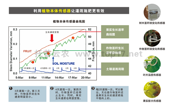 植物本體傳感器,能實(shí)時(shí)或階段性地監(jiān)測植物莖稈粗細(xì)的變化、葉面的溫度、莖流速率、果實(shí)增重與膨大速率、植物的光合作用等植物本身的一些參數(shù),能直觀地反應(yīng)植物的生長狀態(tài)。通過對作物參數(shù)的測量可直觀反映土壤或空氣環(huán)境參數(shù)對作物的影響,從而指導(dǎo)用戶更加科學(xué)合理地調(diào)控生產(chǎn)環(huán)境,以達(dá)到作物高產(chǎn)優(yōu)質(zhì)。