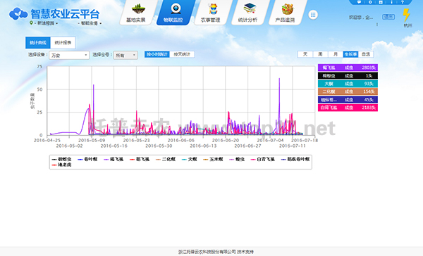 系統(tǒng)通過搭建在田間的智能蟲情監(jiān)測設(shè)備,可以無公害誘捕殺蟲,綠色環(huán)保,同時(shí)利用GPRS/3G移動(dòng)無線網(wǎng)路,定時(shí)采集現(xiàn)場圖像,自動(dòng)上傳到遠(yuǎn)端的物聯(lián)網(wǎng)監(jiān)控服務(wù)平臺(tái),工作人員可隨時(shí)遠(yuǎn)程了解田間蟲情情況與變化,制定防治措施。通過系統(tǒng)設(shè)置或遠(yuǎn)程設(shè)置后自動(dòng)拍照將現(xiàn)場拍攝的圖片無線發(fā)送至監(jiān)測平臺(tái),平臺(tái)自動(dòng)記錄每天采集數(shù)據(jù),形成蟲害數(shù)據(jù)庫,可以各種圖表、列表形式展現(xiàn)給農(nóng)業(yè)專家進(jìn)行遠(yuǎn)程診斷。